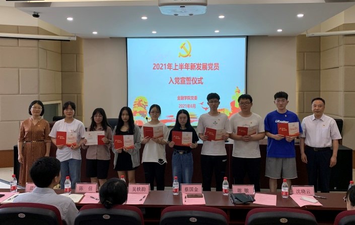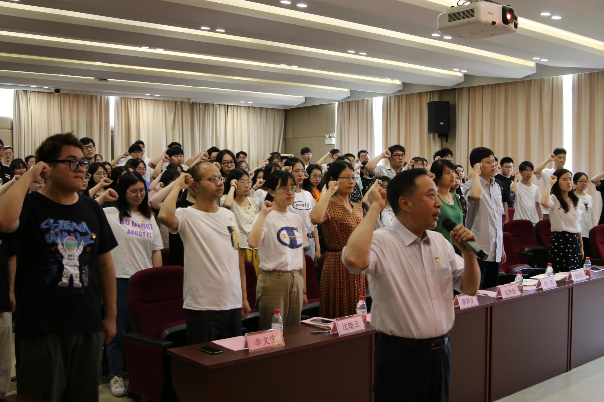 在3号楼202报告厅举行2021年上半年新发展党员入党宣誓仪式暨主题党日活动。学院党委书记蔡国金、党委副书记谢敏、各学生党支部书记、老党员代表、2021年上半年新发展的1名教工党员和119名学生党员参加活动。活动由专职组织员翟丽媛主持。