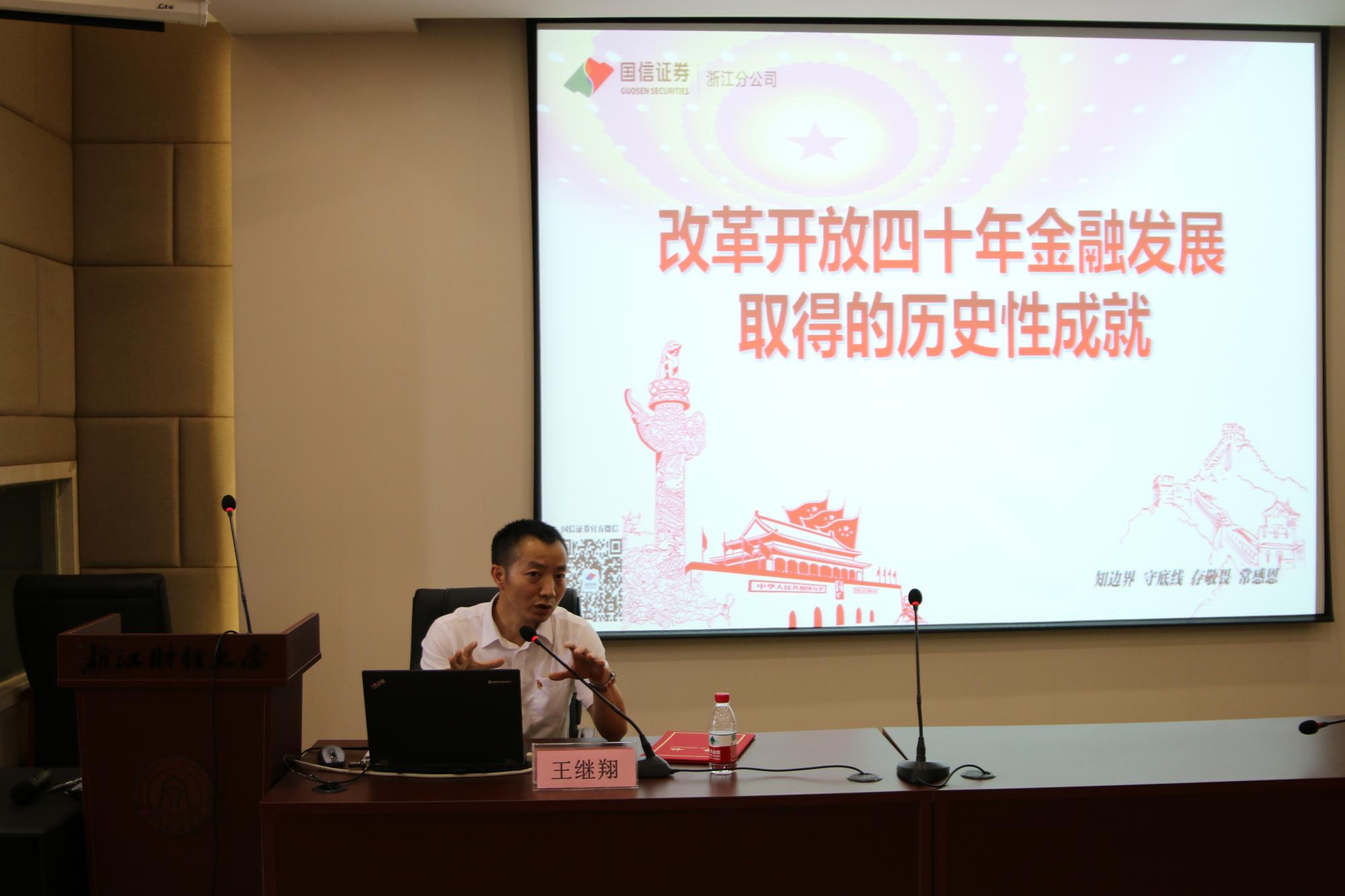 仪式结束后,王继翔以“改革开放四十年后金融发展取得的历史性成就”为题给师生们上了一堂生动的党课。在党史学习教育的背景下,他首先激励金融青年学生们要多样化思考,不仅要扎实掌握课本理论知识,探寻金融专业演变历史,还要对金融实践知识要多加了解。