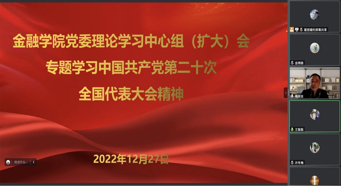 12月27日,水果派 召开线上党委理论学习中心组(扩大)会,专题学习党的二十大精神,校党委委员、副校长王奎泉到会巡听旁听并进行指导,学院党委理论中心组全体成员参加学习,学院纪委委员,系主任、部门主要负责人代表等列席参加。会议由学院党委书记蔡国金主持。