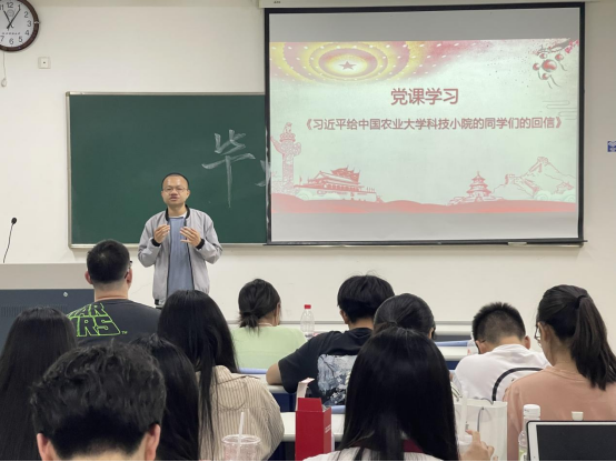 会议第二环节,支部书记李文生老师讲授党课。全体党员深入学习《习近平给中国农业大学科技小院的同学们的回信》,领悟到要以学习总书记重要回信精神为契机,准确把握领袖对新时代青年学生热情勉励、深刻教诲的核心要义。大家紧紧围绕总书记重要回信精神和殷切期望,结合学校实际和自身学习成长经历,畅谈对回信精神的深切感悟,进一步增强与党同心、跟党奋斗的坚定意志。