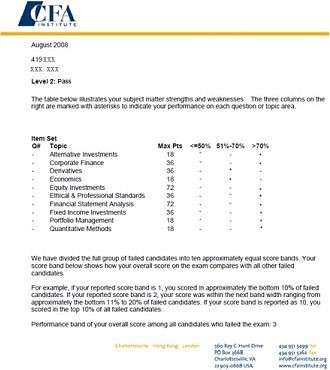 3.评分体系: CFA考试中会对各个科目单独评分,每个科目的成绩分为三档:<=50%、51%-70%、>70%.CFA协会会把考生各个科目成绩汇总做加权平均,从而评判考生是否能通过考试;