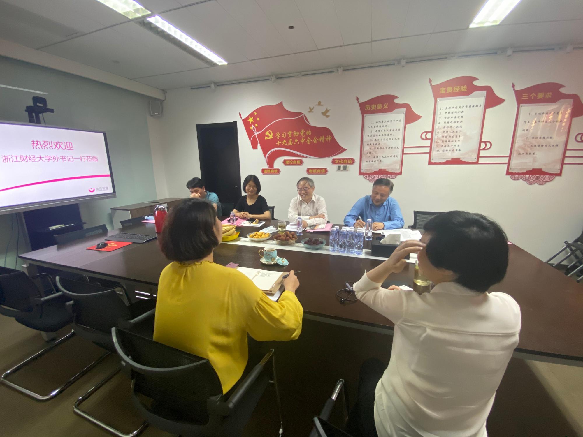 党政班子成员走访了金元证券股份有限公司浙江分公司、中信证券股份有限公司浙江分公司、浙江益恒投资管理有限公司,开展“访企拓岗促就业”专项行动,受到了金元证券浙江分公司总经理、党支部书记、1998届证券投资管理班校友何华,中信证券浙江分公司机构客户部副总经理、1998届证券投资管理班校友徐虹莱,益恒投资董事长、2003届证券投资管理班校友徐冠华等的热情接待。