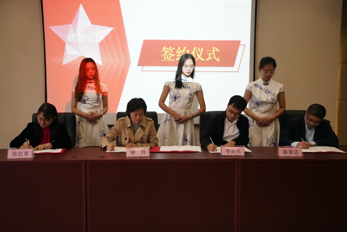 院长陈荣达、社会合作办主任张红英与李启兵及其夫人钟玲分别代表三方签署了捐赠协议。陈荣达、张红英代表学校接收了捐赠支票,并向李启兵夫妇颁发了捐赠证书和纪念杯。