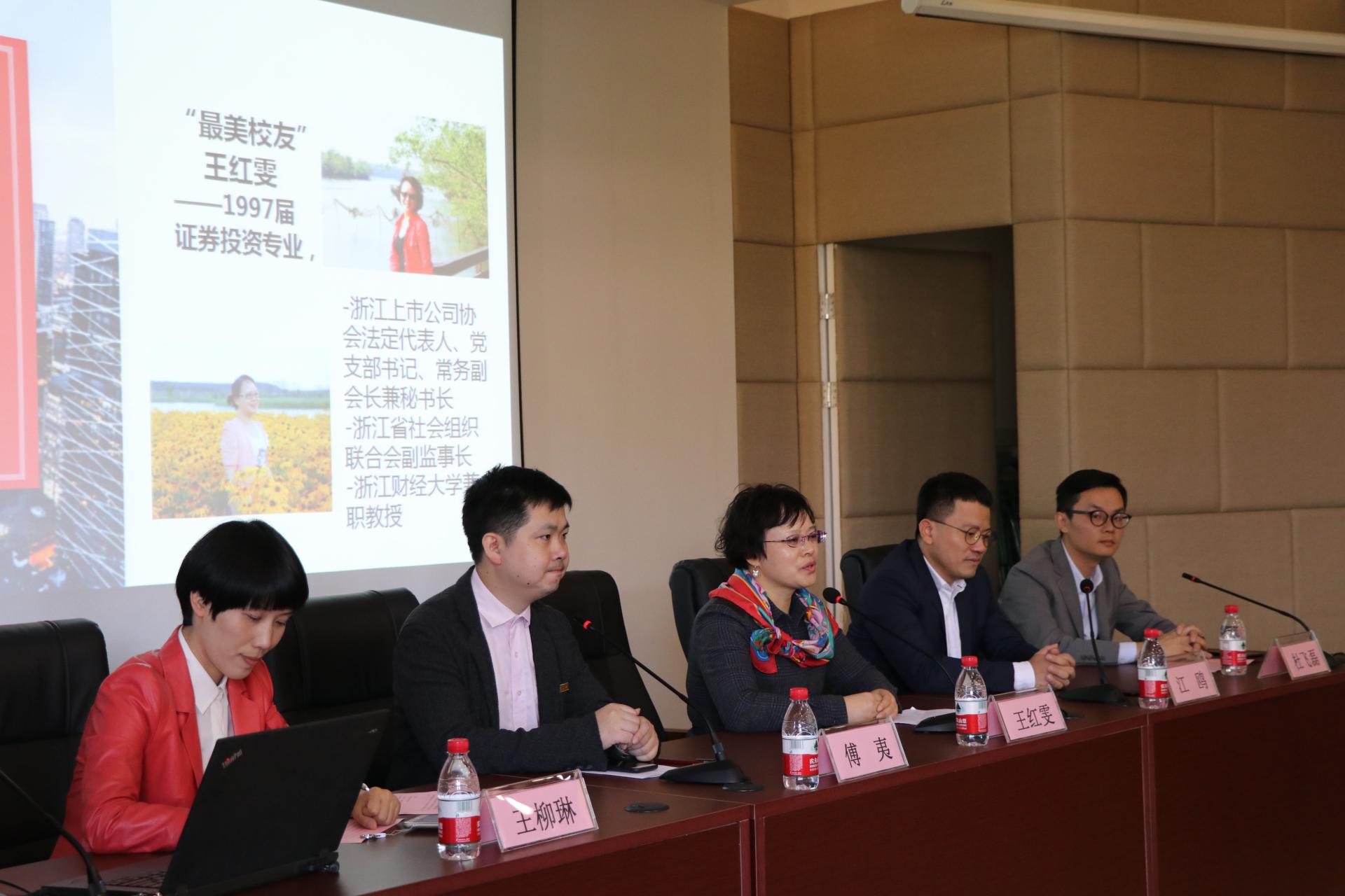 校友会理事会的积极推动下,有幸邀请到了王红雯(浙江上市公司协会法定代表人、党支部书记)、傅夷 (浙江盈阳资产管理股份有限公司执行总经理)、江欧(大唐财富杭州分公司总经理)、杜飞磊(银万资本公司总经理)四位优秀校友并邀请到王柳琳校友(蓝山投资总裁)作为本次沙龙的主持人。校友就职业规划,工作变迁,个人信用方面提出了宝贵的经验与意见,使同学们受益匪浅。