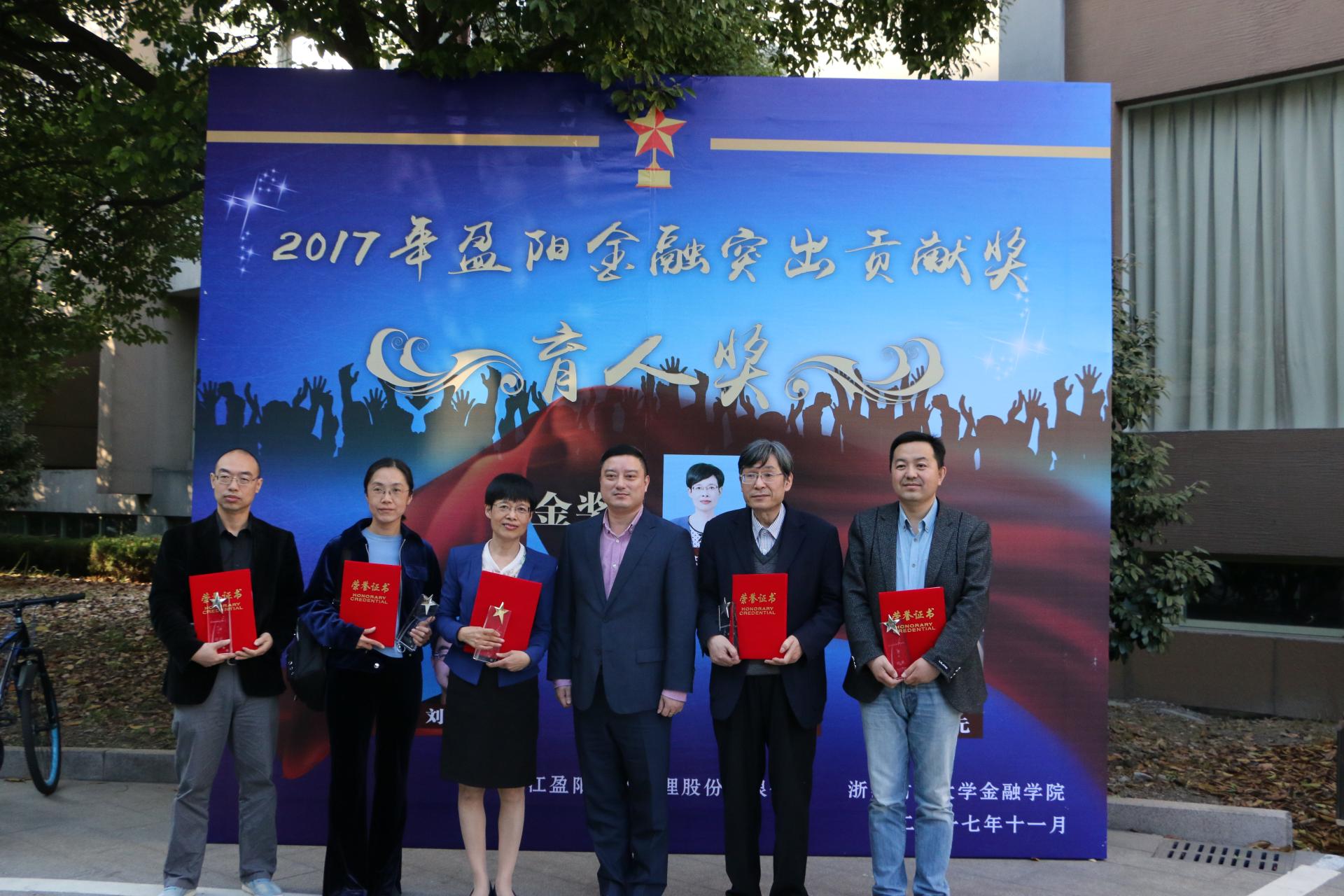下午2点40分,2017年盈阳金融突出贡献奖育人奖颁奖大会在学院楼顺利举办,院长陈荣达,院党委书记蔡国金,院党委副书记叶秀出席了本次大会。经过评比,徐敏老师获得金奖,刘建和、王春发、鲁莹、耿中元老师获得银奖。随后,浙江盈阳资产管理股份有限公司董事孔繁岗及获奖老师代表徐敏发表讲话,总结了自己的经验并对水果派