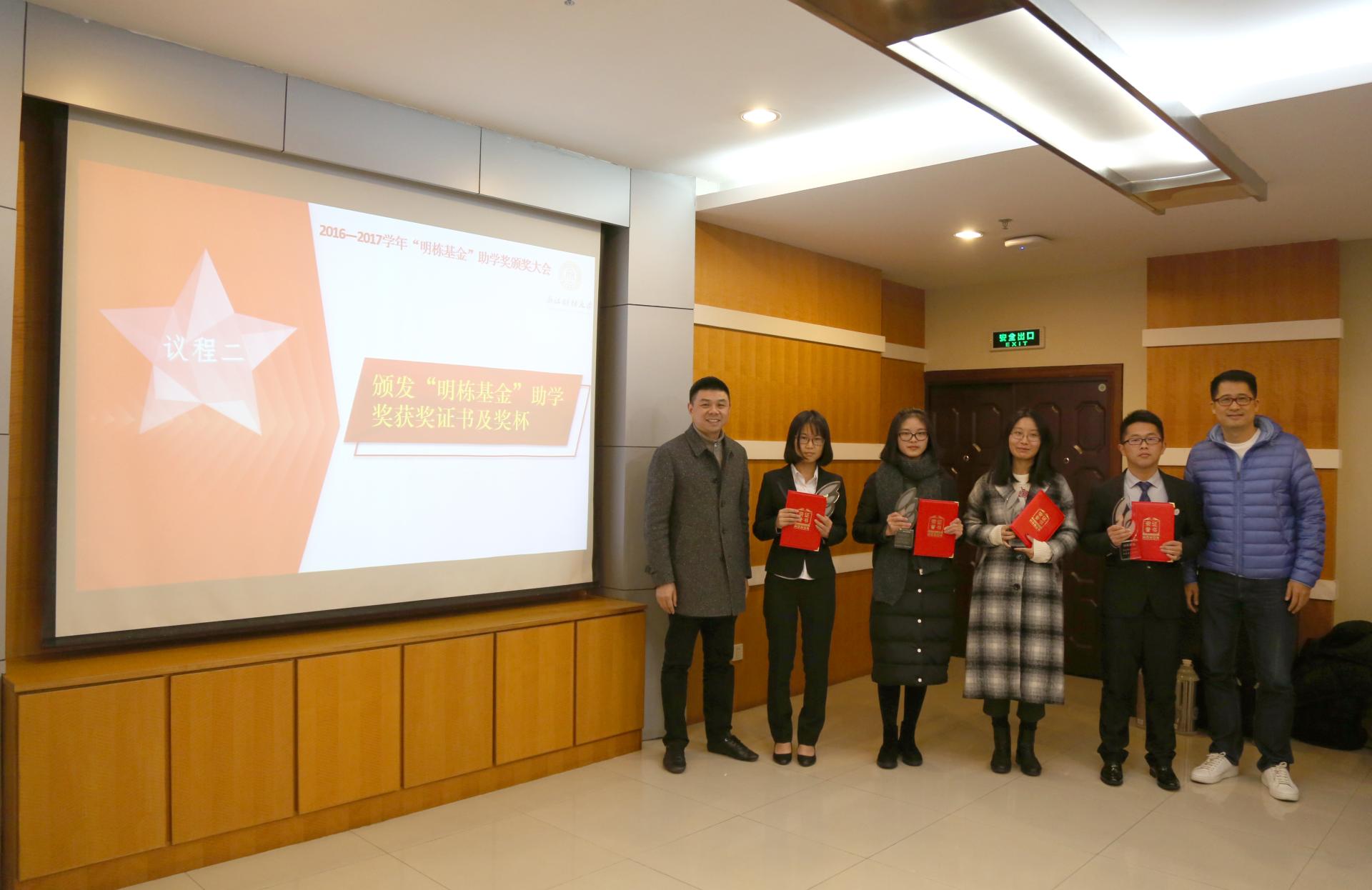 12月16日下午,2016-2017学年“明栋基金”助学奖颁奖大会在行政楼512隆重举行。蓝山投资有限公司董事长王晓明、浙江盈阳资产管理股份有限公司总裁楼栋、蓝山投资有限公司总裁王柳琳、关瑞慈善基金会执行会长吕霞,校党委书记李金昌、相关职能部门负责人、水果派