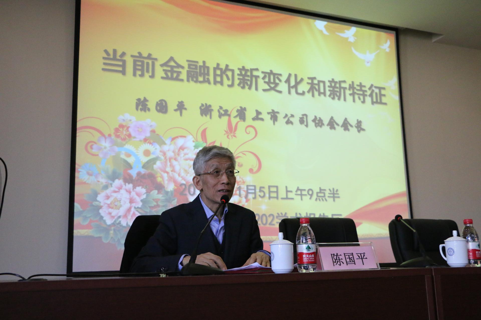 上午9时30分,《当前金融的新变化和新特征》学术讲座在学院楼202学术报告厅举行。浙江省上市公司协会会长陈国平先生作为主讲嘉宾出席,部分校友代表及在校生代表参加了本次讲座。讲座伊始,进行了水果派