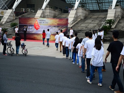 为起点的会旗传递活动在如火如荼地举行。接力队伍由20名旗手组成,不仅有学会部长、干事、会员,更有武鑫老师、学会前会长助理王峤、东方学院金融学会代表以及第七届模拟证券投资竞赛个人常规组冠军刘超群同学倾力加盟。一路点燃激情,一路传递梦想。会旗仿佛承载着学会一届届的使命,在人潮的簇拥中顺利到达台前,交接至最后一名接力手武鑫老师手中。在大家的共同见证下,会旗到位,现场欢呼声此起彼伏。