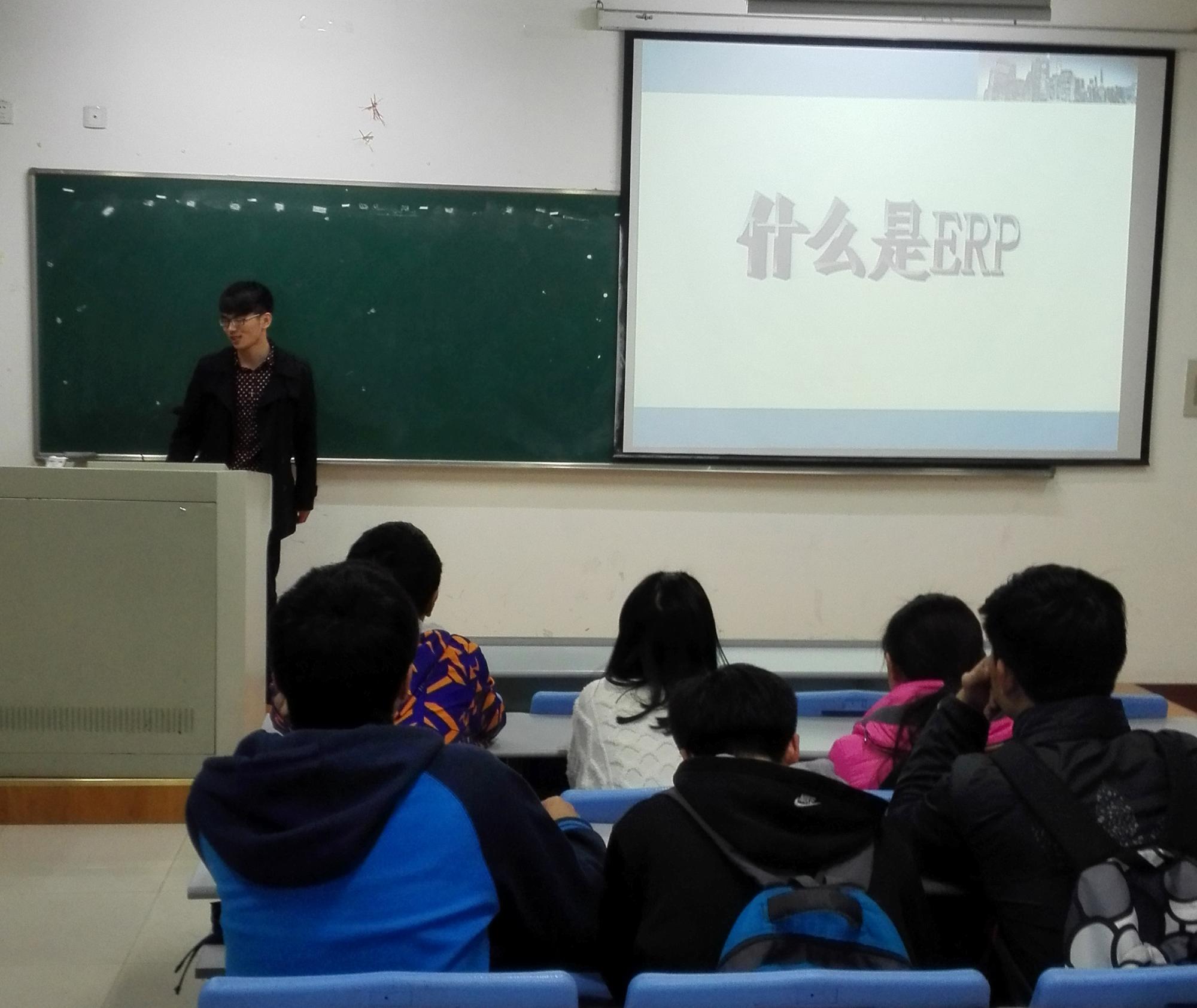 3月22日晚上8点整,由信用管理学会主办的信管大讲堂在学院楼209开讲,本次讲座由信用管理前会长、公司金融学会前副会长邵勇主讲。在本次讲座中,邵勇向前来参与讲座的同学们介绍了ERP的相关知识,分享了自己的一些参赛经历,并就工作就业方面和同学们作了交流。