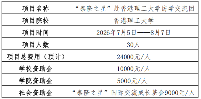 备注:①本次项目总费用预计24000元(包括项目费用、交通费用、签证费用、保险及部分餐食补贴),由学校资助+学院资助+社会资助组成,其他学生自行消费部分由学生本人承担。②香港理工大学访学项目介绍详见国际交流合作处项目介绍//mp.weixin.qq.com/s/4HA7chS63hMEIhlFDe2aMg。