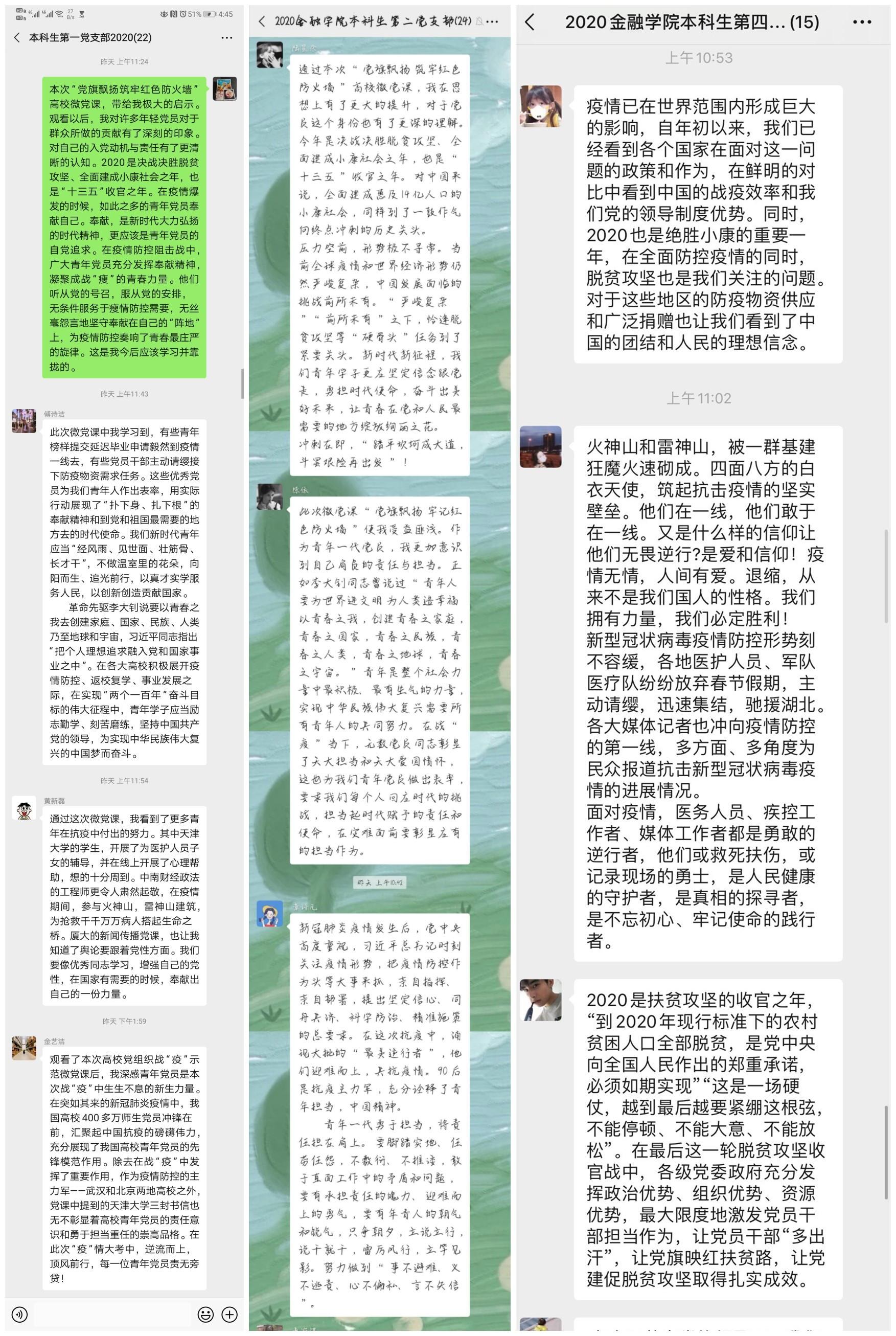 研究生第三党支部胡梦丹说:“自新冠疫情暴发以来,党中央高度重视、全面部署,各级党委政府守土有责、靠前指挥,党员干部坚守一线、心系百姓。这是一次国家治理体系和治理能力的大考,是一个考验党委政府意志信念的考场,是一场检验党员干部‘不忘初心、牢记使命’的主题考试。通过观看微党课,我更加体会到了在疫情面前,没有从天而降的天使,只有逆行而上的英雄。作为一名中共党员,我明确了自己的责任与担当,学会了心有大我,能够做到一方有难,八方支援。”