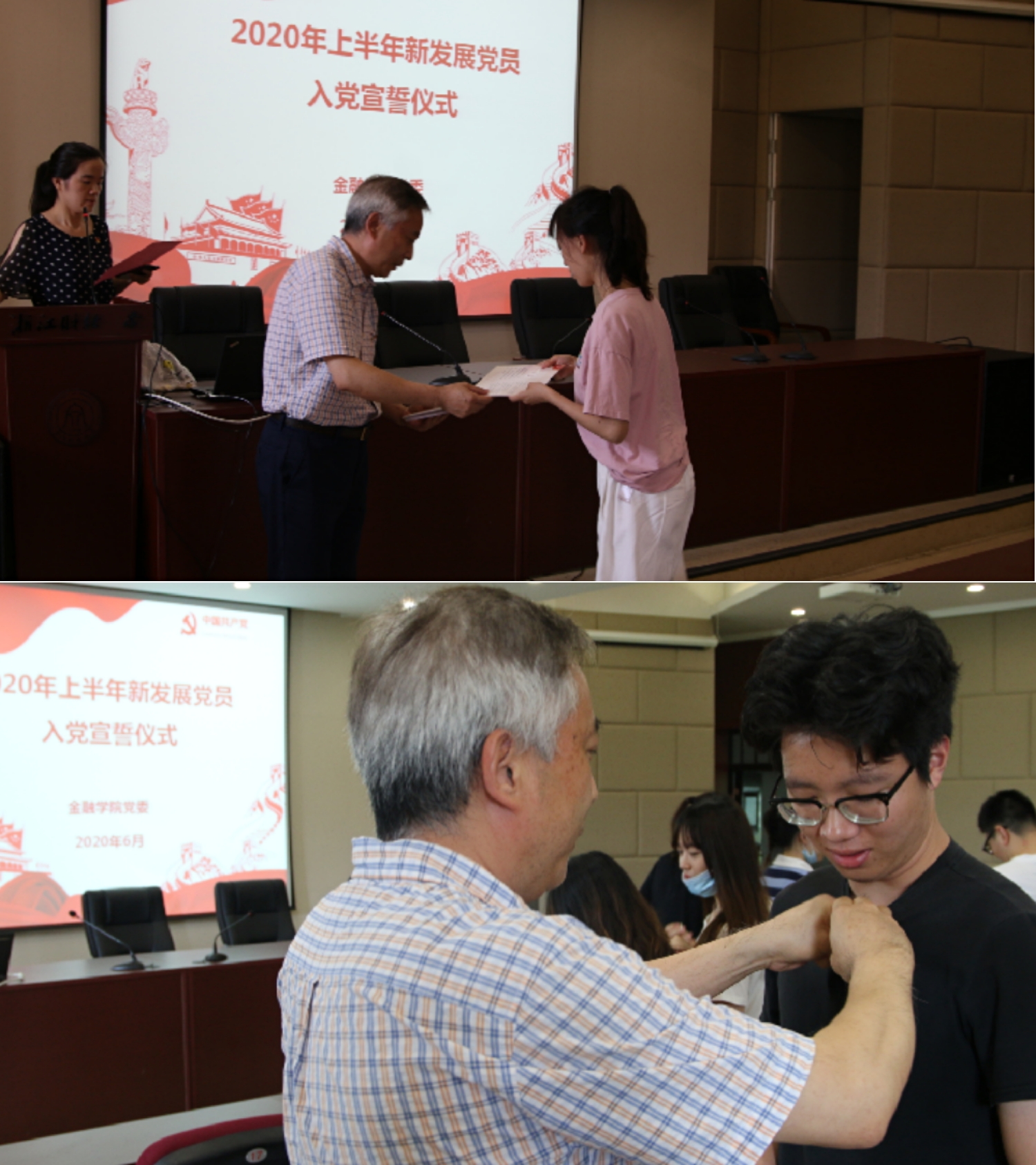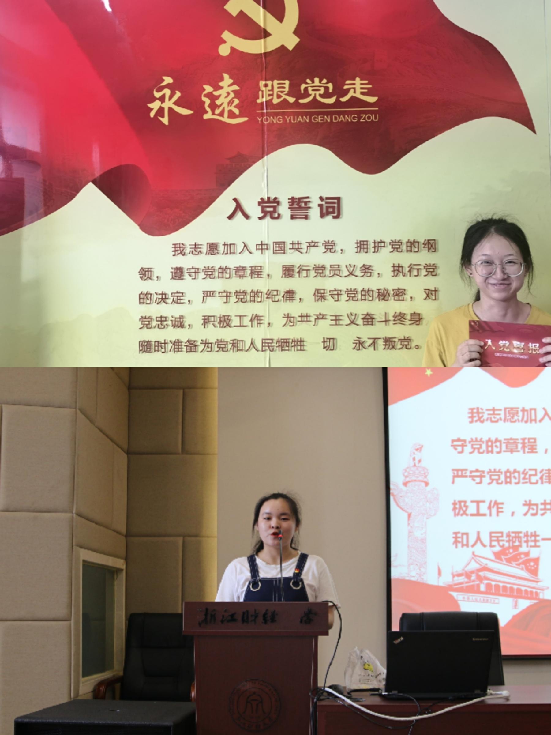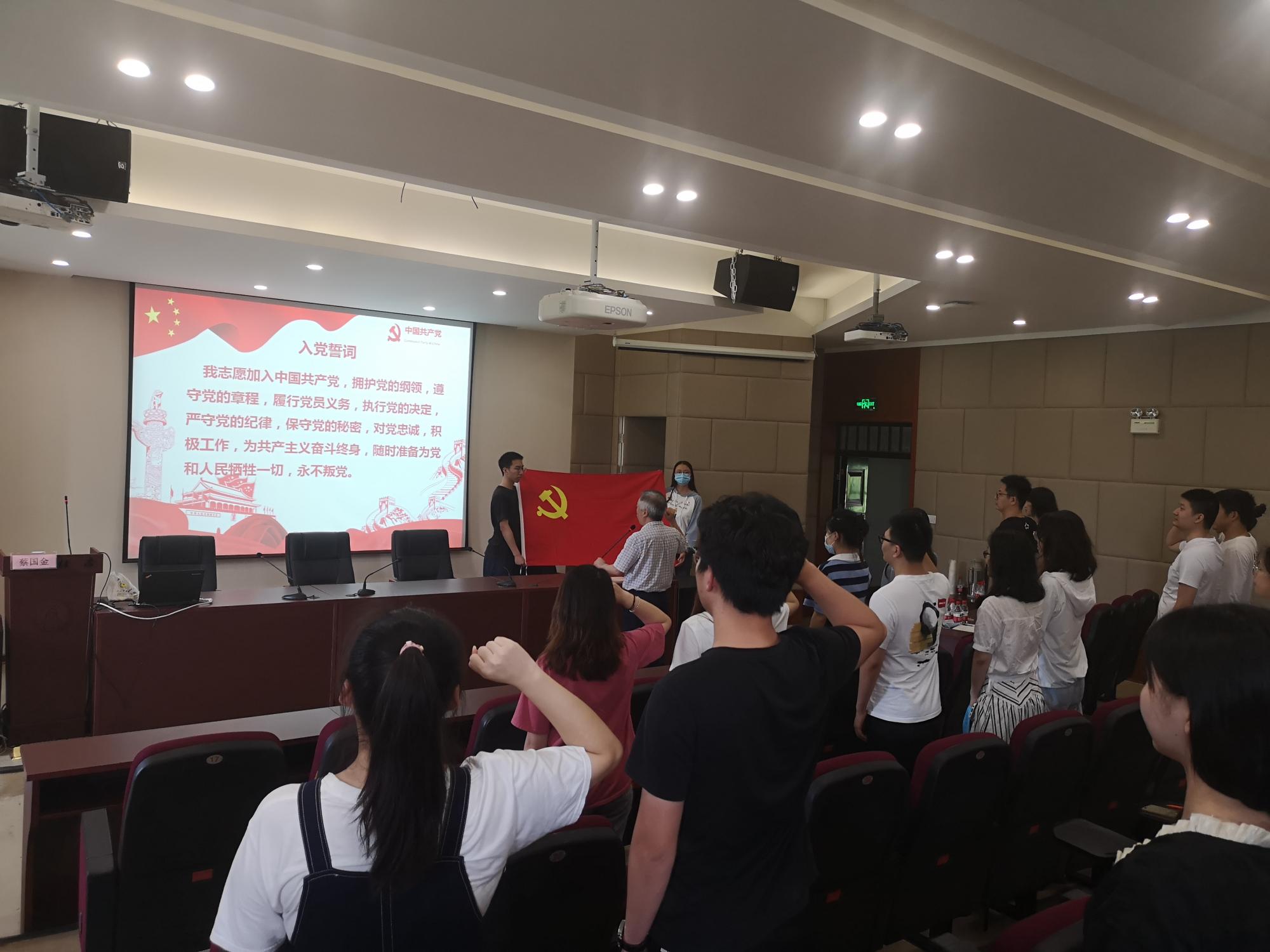 宣誓仪式上,各位老党员给新党员们佩戴党徽、赠送政治生日贺卡。而后,全体新党员在蔡书记的领誓下,举起右手,昂首挺胸,面向党旗庄严宣誓,表达对党忠诚和愿意为共产主义事业奋斗终生的决心。本科生第二党支部丁洁婷同志代表新党员发言,表达了不忘初心跟党走、争做优秀共产党员的坚定信念。