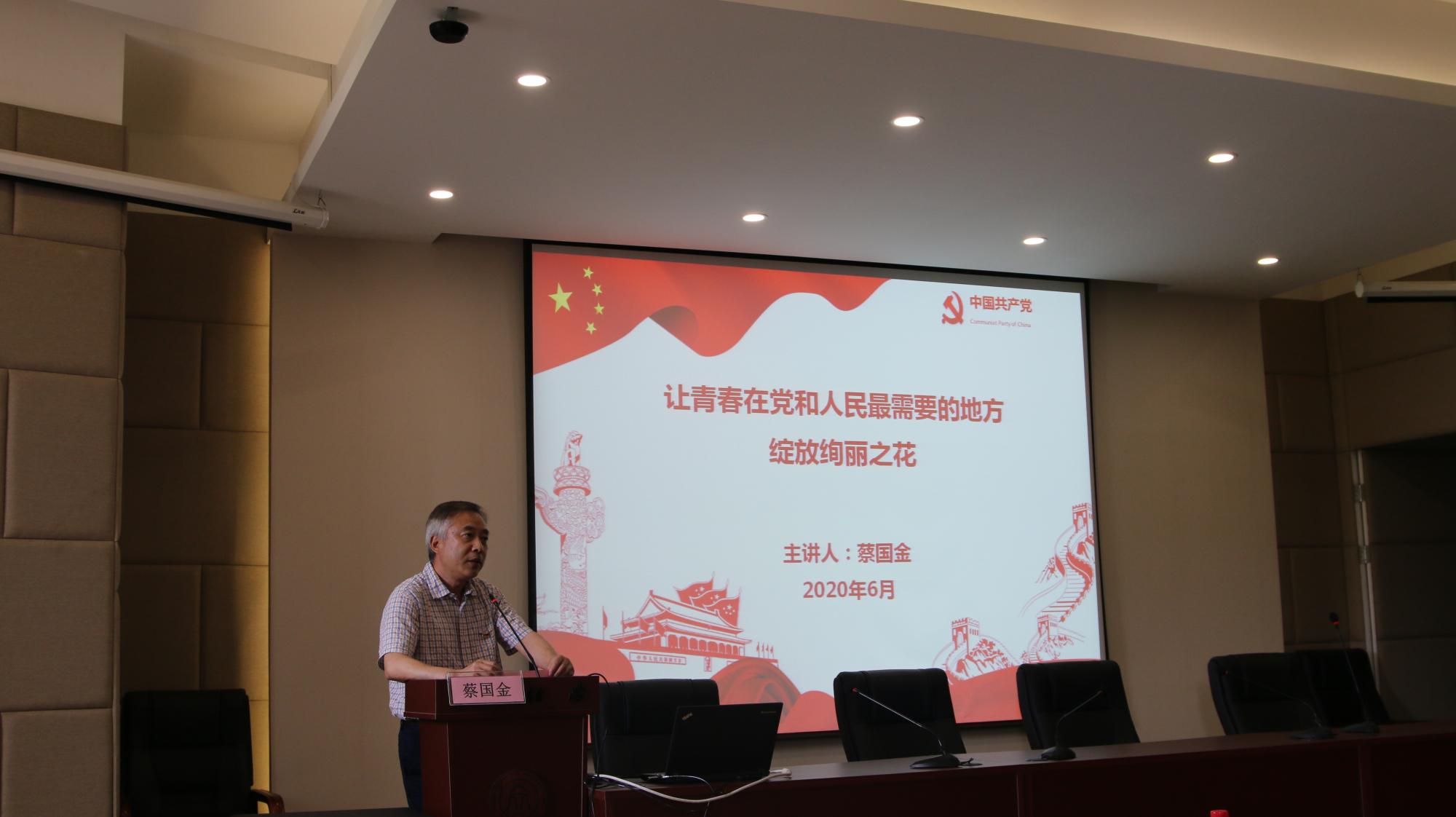 党委书记蔡国金以“让青春在党和人民最需要的地方绽放绚丽之花”为主题给各学生党支部书记、支委及全体2020年上半年新发展党员上了一堂微党课。他带领全体党员再次学习习近平总书记给北京大学援鄂医疗队全体“90后”党员回信,深刻阐释了习近平新时代中国特色社会主义思想,勉励大家立大志、勤学习、敢作为,激扬青年力量,做新时代好榜样,绽放绚丽之花。另外,蔡书记对党员同志们还提出了三点要求:第一,要加强理论学习,不断提高政治思想素质;第二,认真参加组织生活,不断加强党性锻炼;第三,要不忘初心,牢记使命,充分发挥先锋模范作用。让全体党员更深地体会到作为一名党员应该具备的责任担当,以实际行动为实现中华民族伟大复兴的中国梦奉献青春力量。