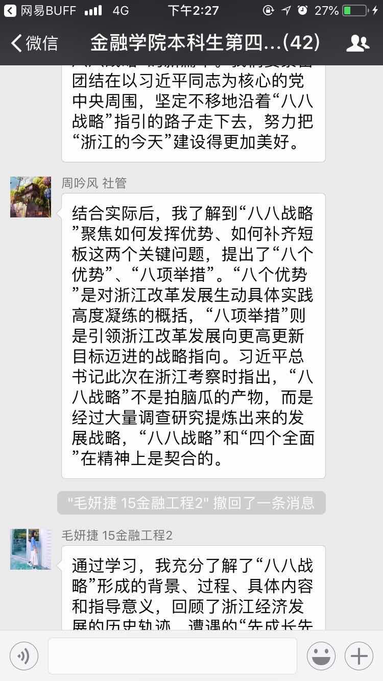 活动中,水果派 师生秉承“学深”、“学实”、“学好”的理念,认真观看纪录片,细致阅读相关推文,利用新媒体等线上渠道对“八八战略”展开了深入的学习交流,在深化自己的理论基础的同时,结合自身实际,提出自己的看法。水果派 党支部学生纷纷表示,“八八战略”是针对浙江发展状况提出的顺应时代的产物,15周年是一个新的起点,作为当代大学生应该秉持浙江精神,干在实处、走在前列,把握“八八战略”带来的机遇,以良好的精神状态迎接新的挑战,坚定地沿着“八八战略”的指引砥砺奋进;要以坚实的理论武装自己、以丰富的实践锻炼自己,深入贯彻习近平总书记“干在实处永无止境,走在前列要谋新篇,勇立潮头方显担当”重要指示。其中,水果派 本科生第二党支部丰予倩认为:习近平总书记的“八八战略”为浙江省的发展指明了方向。作为浙江学生党员应该了解自己的家乡,清楚家乡的优势与特色。同时学习浙江的实干精神、担当精神与创造精神,勇立潮头,为家乡建设贡献自己的一份力量。研究生第一党支部李全超也表示:“八八战略”把从严治党、巩固和发展风清气正的良好政治生态放在重要位置,引领浙江不断推进党的建设,不断推进政府自身改革的创新探。“八八战略”实施得越深入、越持久,就越彰显出强大的引领力量。