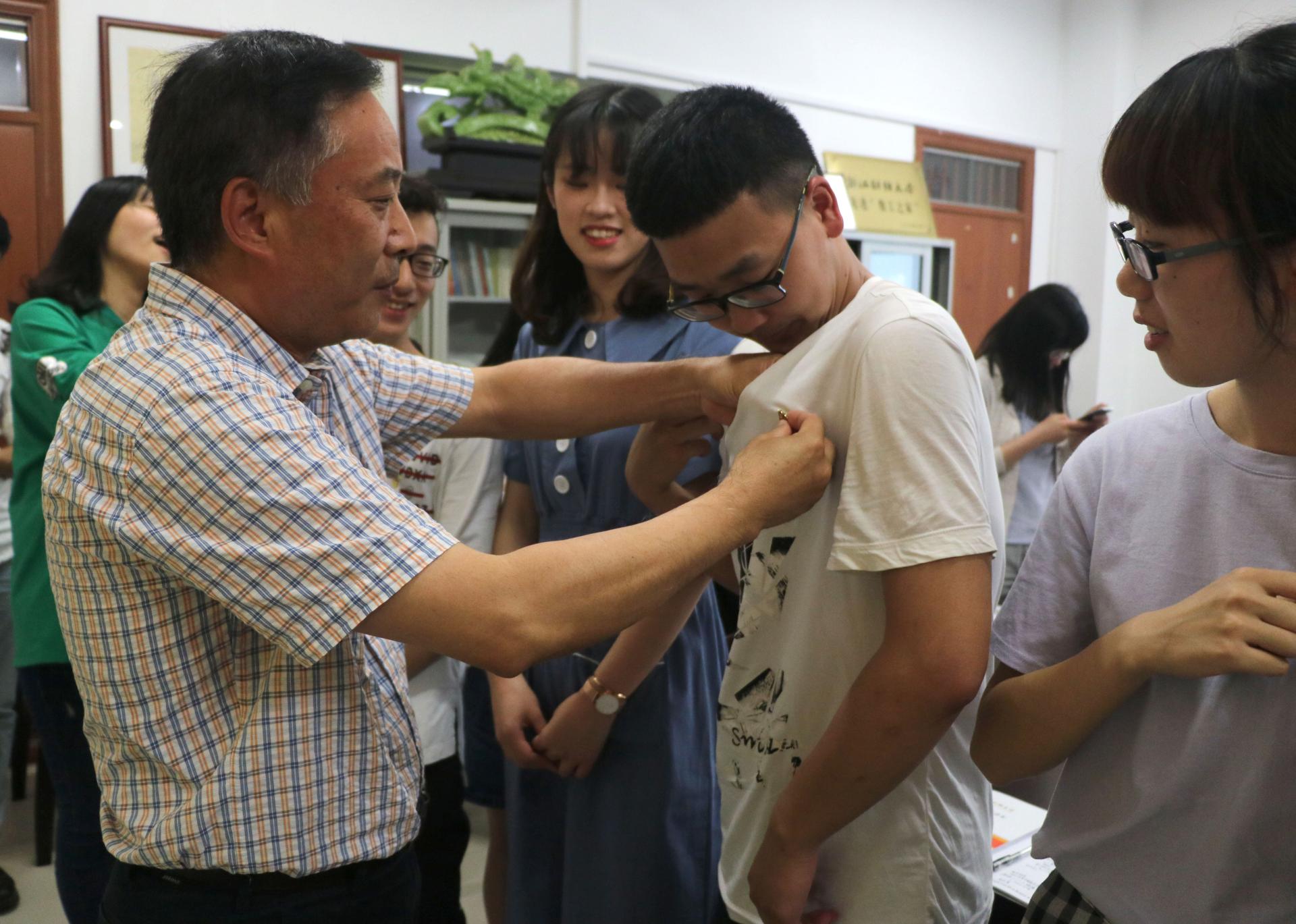 随后,叶秀书记带领全体师生党员在党旗前庄重宣誓,“我志愿加入中国共产党,拥护党的纲领,遵守党的章程……”,庄严肃穆的入党宣誓,让在场所有党员接受了一次党性教育,进一步坚定了政治立场。宣誓完毕后,蔡书记与叶书记为新发展党员佩戴了党员徽章。