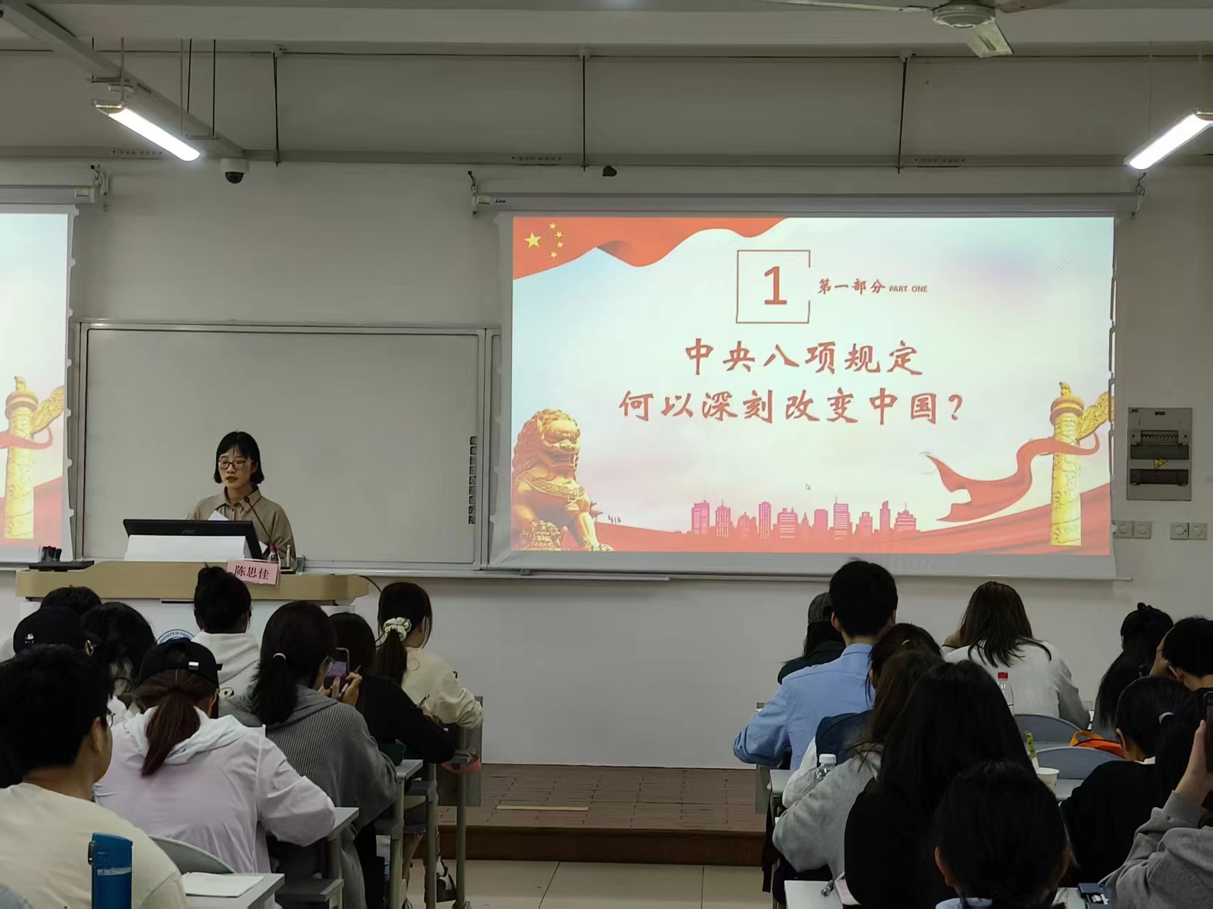 陈思佳以《扎实开展深入贯彻中央八项规定精神学习教育》为主题,紧紧围绕习近平总书记关于加强党的作风建设重要论述,从中央八项规定精神的理论内涵与实质、党的作风建设历史沿革等方面进行了深入解读。通过课程学习,入党积极分子们深刻认识到,在今后的学习和工作中,要严守纪律规矩,始终保持廉洁自律的作风。
