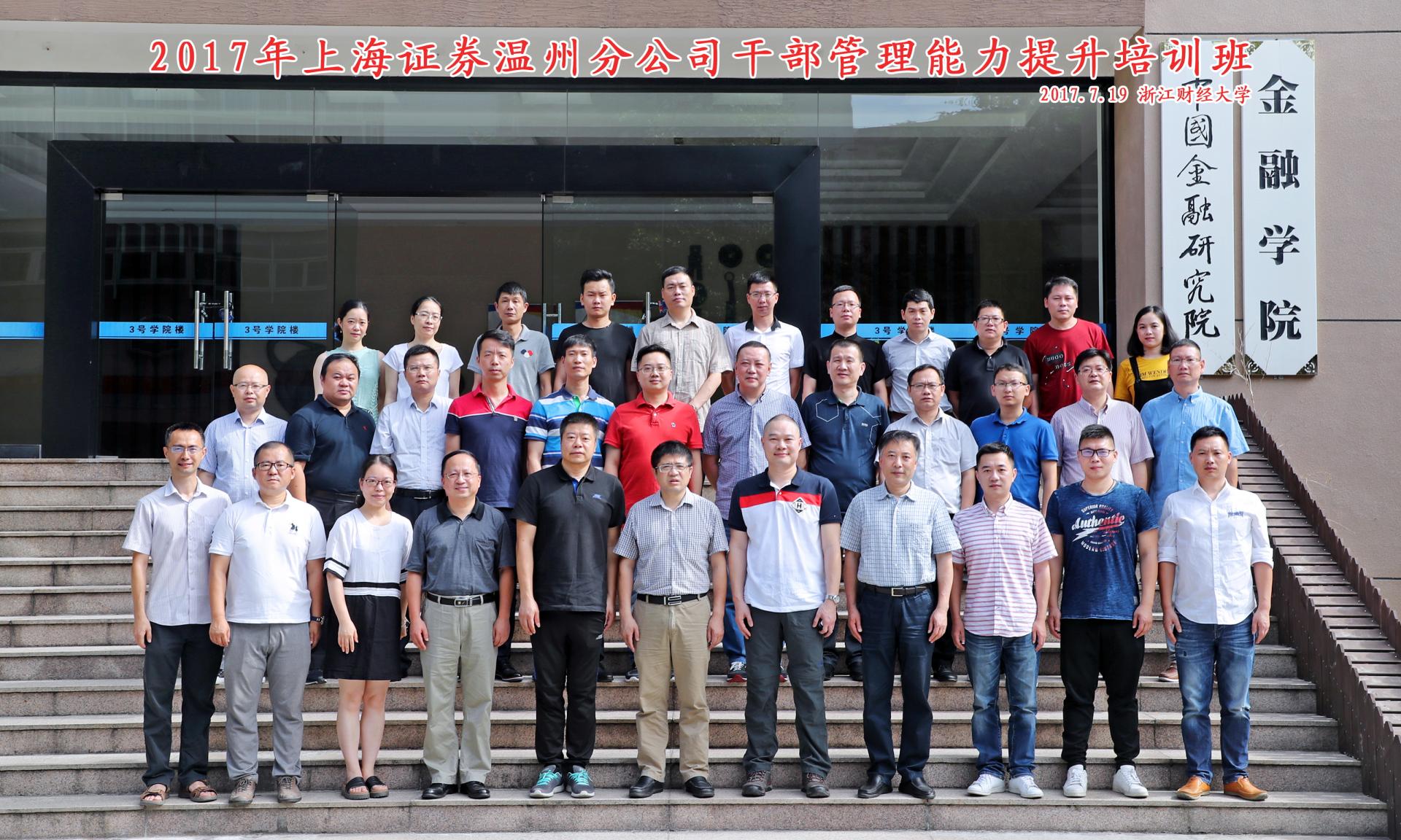 2017年7月19日上午,2017年上海证券温州分公司干部管理能力提升培训班在水果派 楼二楼学术报告厅隆重举行开班仪式。开班仪式由蔡国金书记主持,陈荣达院长、上海证券温州分公司蔡晓敏总经理等出席本次会议,上海证券温州分公司营业部负责人等管理干部近30...
