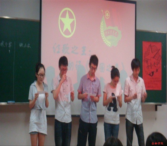 5月19日下午1点30分,水果派 楼204教室红歌嘹亮、诗声朗朗。为迎接中国共产党90周年华诞,调动团组织和青年团员积极向上的精神面貌,08金融2班团支部在此举行“青春·使命”主题团日活动。此次团日活动分为三个环节:“红色经典回忆”、“红歌颂”、“团歌...